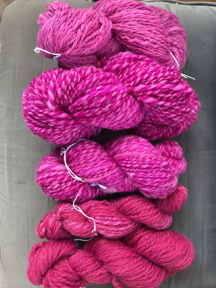 Love all the pink yarns. I think the solids would make nice boarders to the traditional “handspun” skeins for a bright cowl or cuffs for a bright pair of mittens.