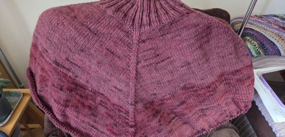 As hoped, the weight of it is pulling the ribbed neck so it isn’t as snug.  I am glad I left it, so if you make it yourself don’t be tempted to make the neck wider at the start…it will spread.  I dyed the yarn years ago, I don’t mind the skein in the middle being so different.