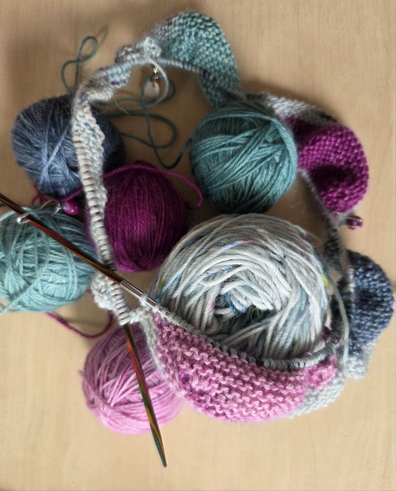 The yarns are gorgeous.  The background colour is Cookston Crafts merino, alpaca, nylon in the  colour Crathie.  The Gemstones are a bundle of minis from Iolair Yarn, their Luing base, which is 70% alpaca, 20% silk and 10% cashmere.