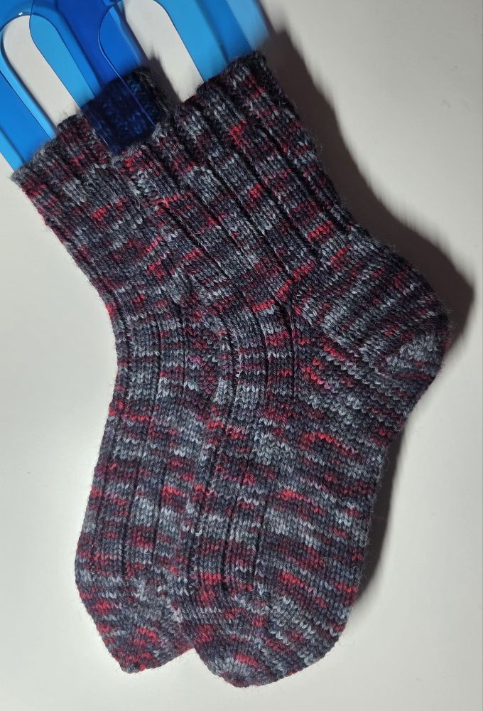 I finished my DK socks. West Yorkshire Spinners Colour Lab in Rock. Mostly I follow Deb’s Super Simple DK socks pattern, but I do 3×1 rib to make them fit better.