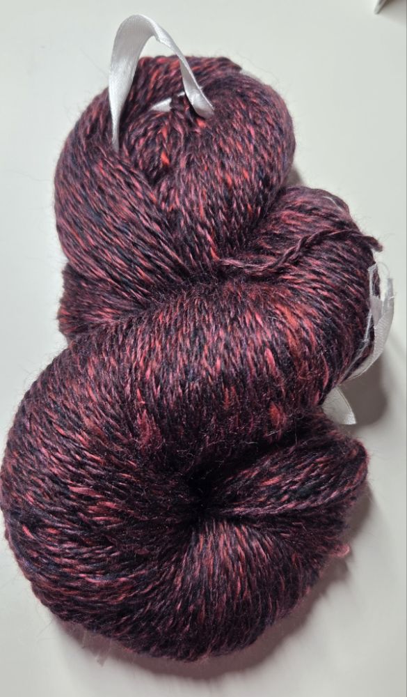 I also finished spinning the Bluefaced Leicester and Mulberry Silk. The blend was from World of Wool called Jellyfish Sprite. It is a little over 150g of sport weight. I need to set it and then can use it for a weaving project. It was black BFL and red silk.