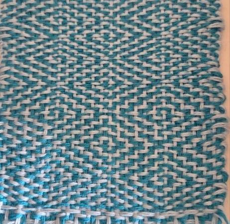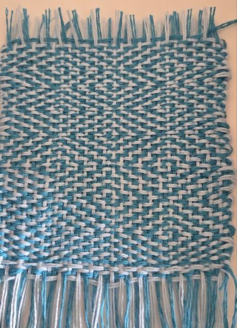The outcome hasn’t been ideal, the cotton has more stretch in it than the other brand I have used for the darker colour. It was getting frustrating so I have cut off my first little sample and have tied it on again to continue. I need to neaten my edges up and the pattern is a little squished. So I shall keep practising on this little sample. I suspect on another project this cotton will be fine for weft, but for warp I will stick to my usual Venne or Handweavers Studio 8/2 cotton yarns.