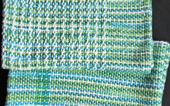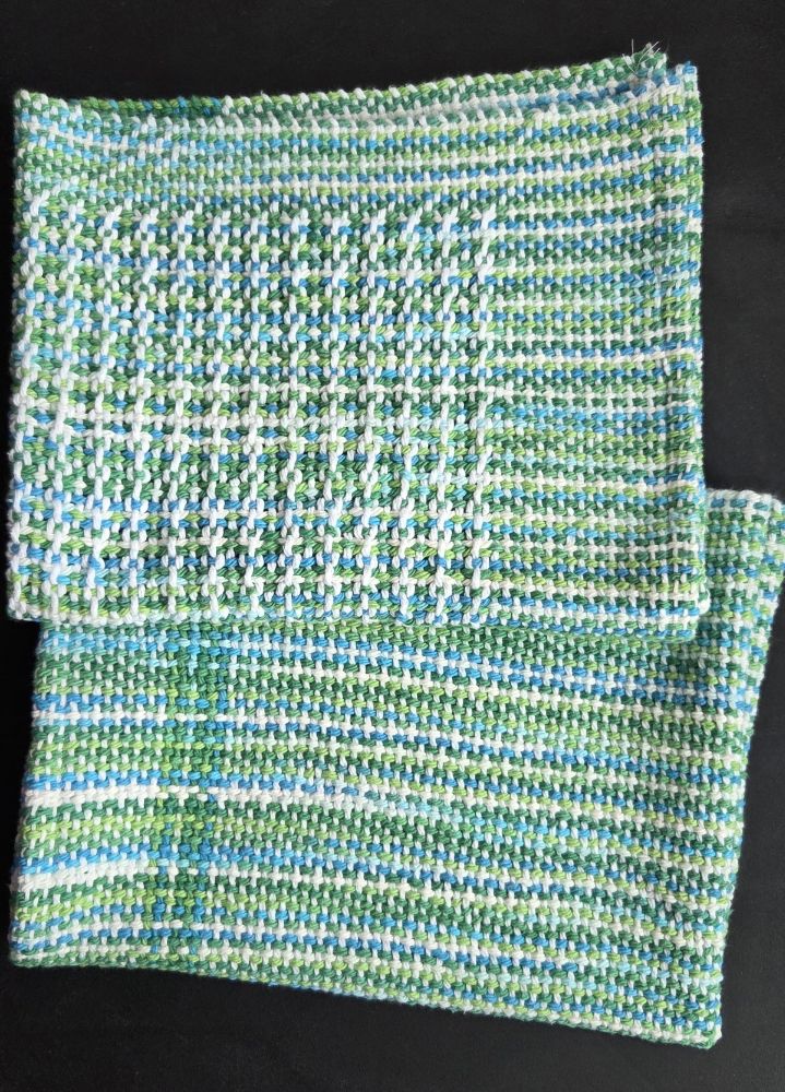 Yesterday I hemmed the towels I recently wove and I am pretty happy with them. The yarn is Lily’s Sugar’n Cream cotton in white and Emerald Energy.