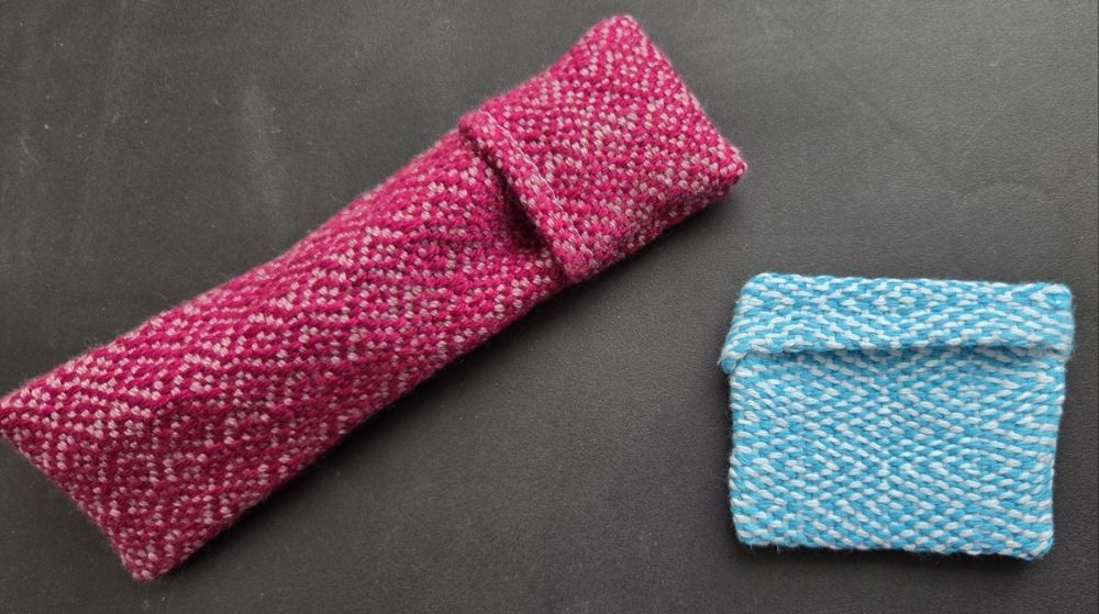 The one on the left was a sample of Diamond Stripe pattern by Kelly Casanova that I wove ages ago using WYS Exquisite Lace. I have turned it into a glasses pouch for my cheap reading specs.